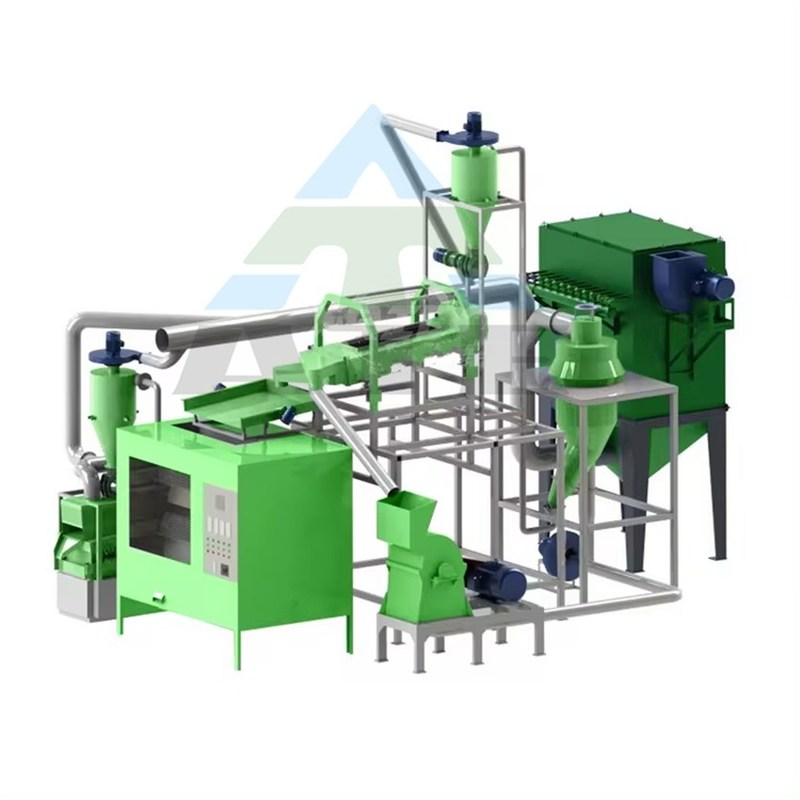 3에바와 에바 배그 플레인 분쇄 및 분리 플랜트. 에바의 원료는 50 × 50mm 크기의 이중 샤프트 쉐리더에 공급됩니다. 그 다음 두 번째 망치 Mi로 이동합니다. 크기가 10 × 20mm입니다.그 다음 원자재는 3mm 미터 미만의 혼합 금속으로 만들어집니다.. 아라비티 분리기는 금속을 비금속에서 분리합니다.그 다음 정전 분리 기계는 실리콘을 플라스틱으로 분리합니다. 공기 오염을 피하기 위해 전체 스프레임이 모자 먼지 포착 스프레임과 함께 구성됩니다.